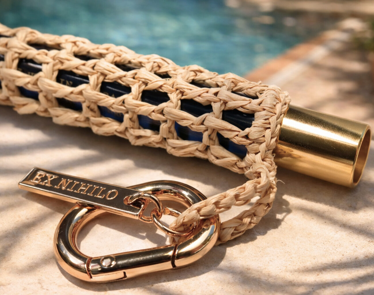 Nos équipes ont conçu un écrin en raphia, entièrement tressé à la main dans nos ateliers de Madagascar, destiné à envelopper la miniature du parfum. L’ensemble est rehaussé par des éléments en métal Zamak : un mousqueton et une étiquette gravée « EX NIHILO », ainsi que par un pochon en coton pensé pour accueillir et protéger l’ensemble.