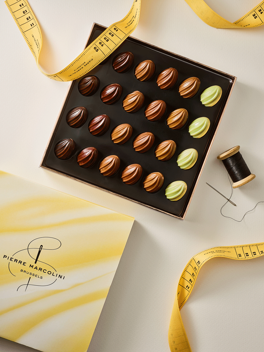 With this in mind, SERAM created single-sided printed polyester ribbons designed to look like real measuring tapes. They wrap around the boxes in the collection, highlighting the packaging design and revealing a refined assortment of chocolates and Easter treats to share.